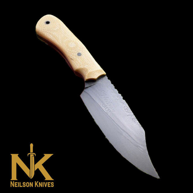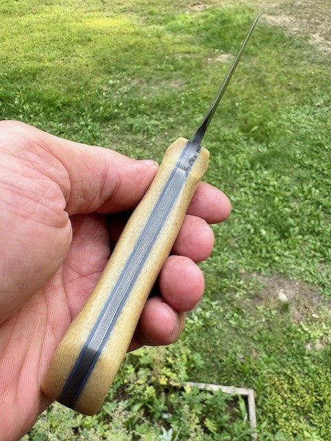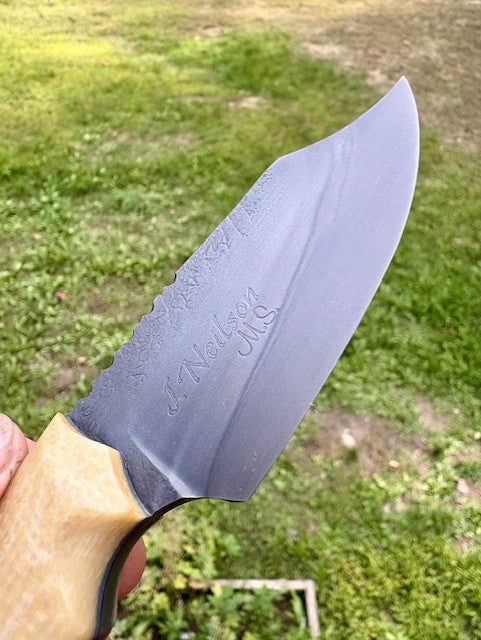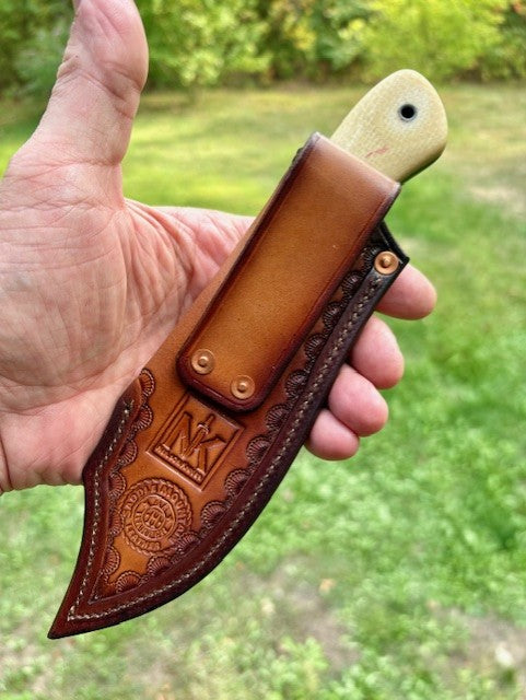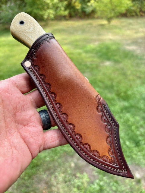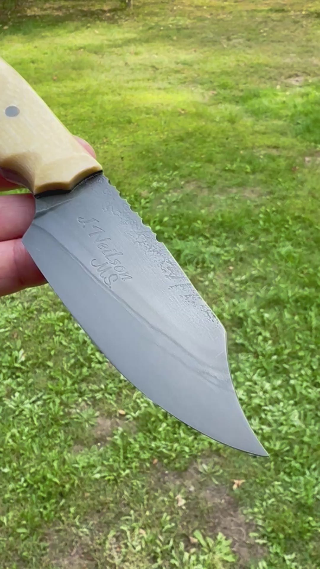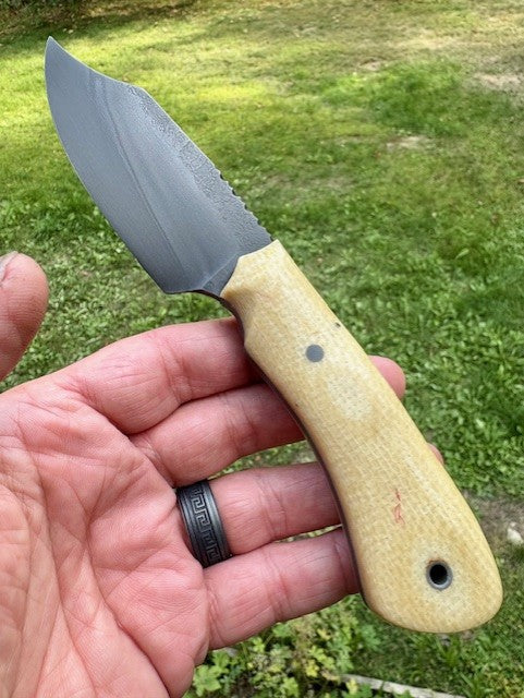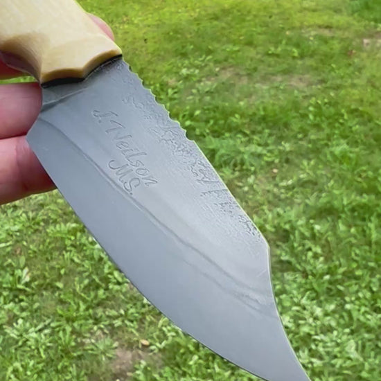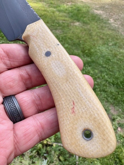 This full-tang Hunter/Belt Knife forged from 1084 high carbon steel. This knife is edge-quenched with hand-rubbed bevels and etched to show the multiple Hamon/quench lines. This blade also has a curved clip and a file worked thumb rest. This blade has a 3 3/4" cutting edge and is 8 1/4" overall, weighing in at 6 oz. The handle scales are "Vibe" Composite Raw Jute Micarta (raw/undyed) done in my "palm swell" style with Grey G-10 tang liners and secured with a Grey G-10 pin and lanyard liner (as a 2nd pin). This knife comes with a border tooled/two-toned leather pouch sheath with a belt loop by Gerald Harper, Saddle Mountain Leather.