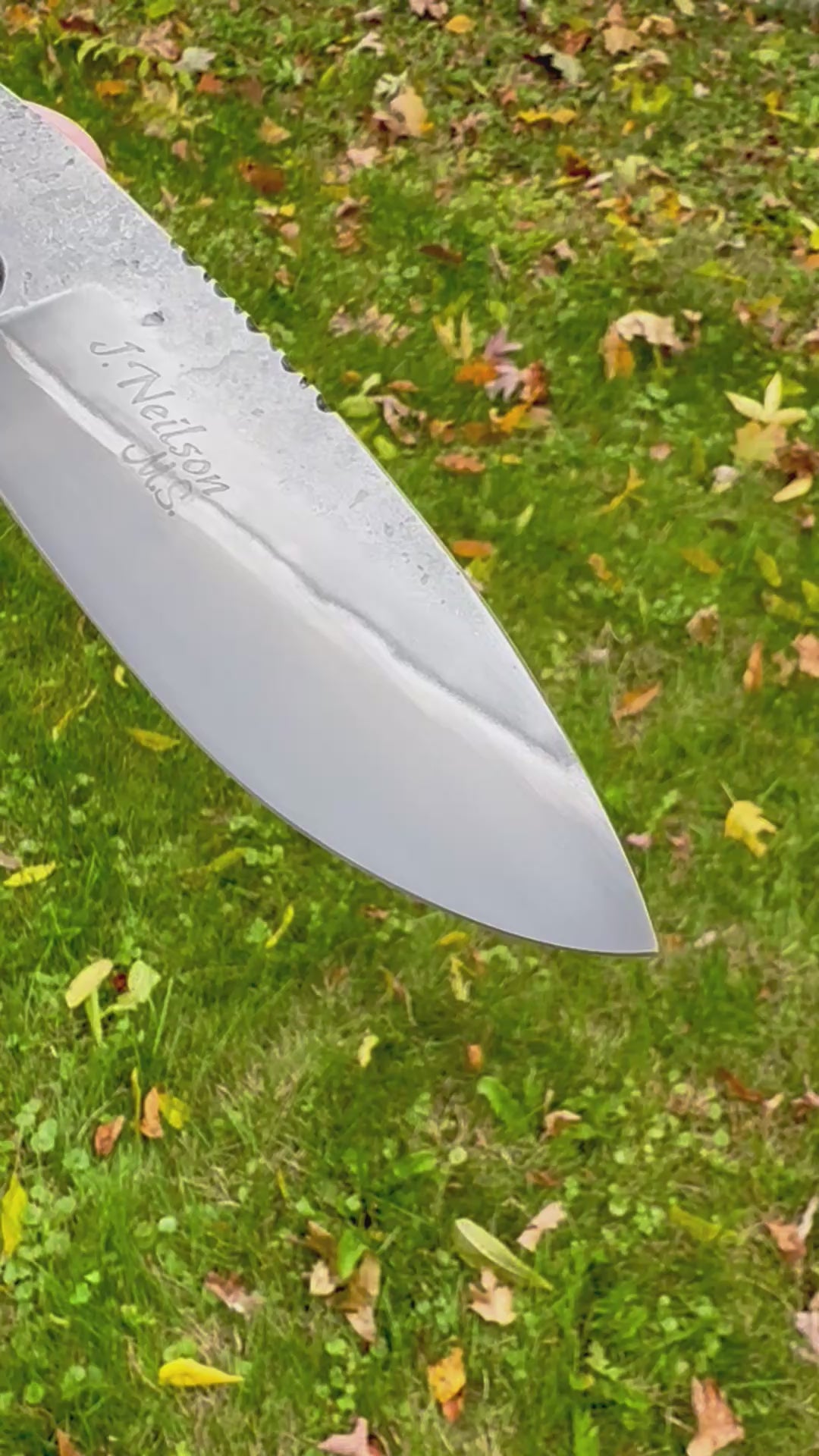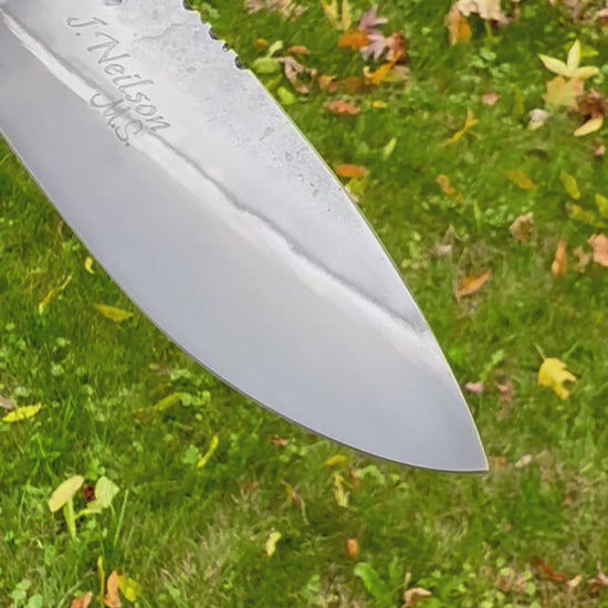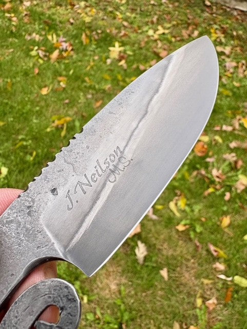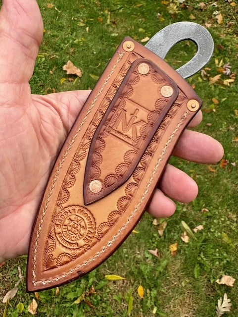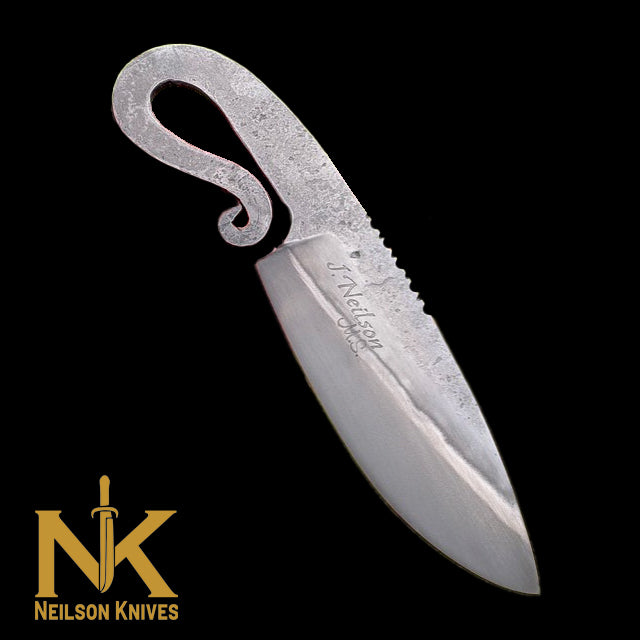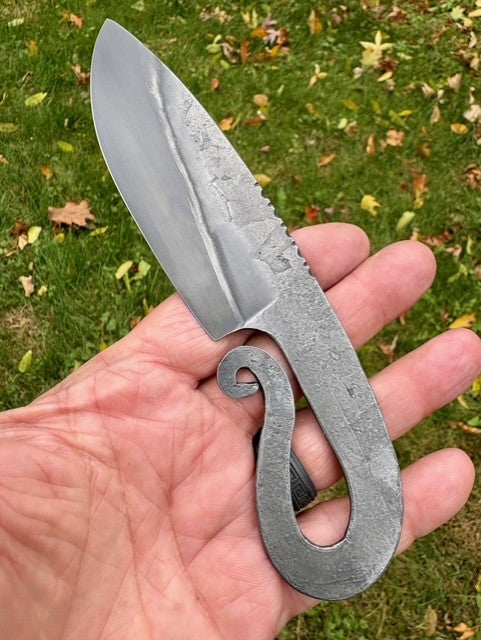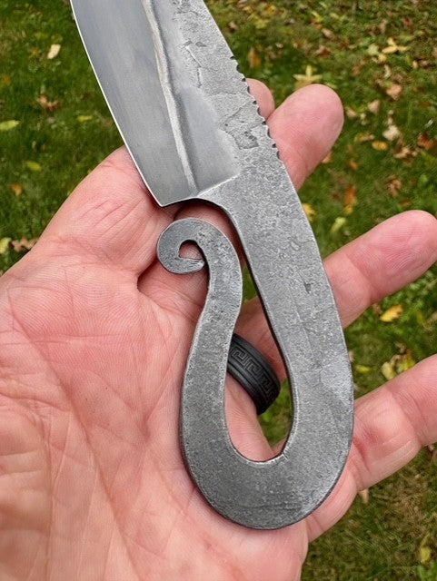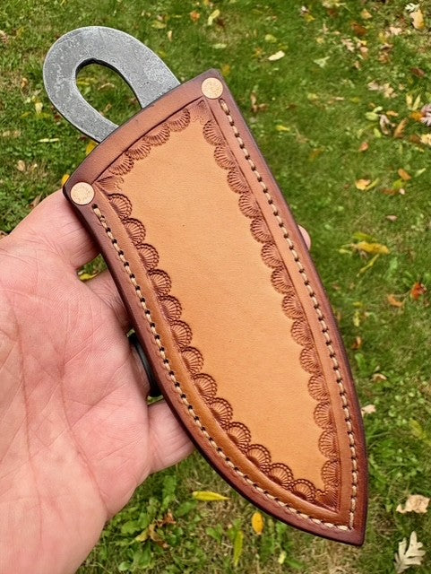 This curly tailed Hunter/Utility Knife is forged from 1084 high carbon steel. This knife has hand-rubbed bevels and is edge-quenched and etched to show the Hamon/quench lines. This piece also has a file worked thumb rest and forge marked/acid soaked flats. This blade has a 4 1/4" cutting edge and is 7 1/8" overall, weighing in at 5.4 oz. The steel tang is drawn and curled into a handle. This knife comes with a border tooled leather pouch sheath with a belt loop by Gerald Harper, Saddle Mountain Leather.