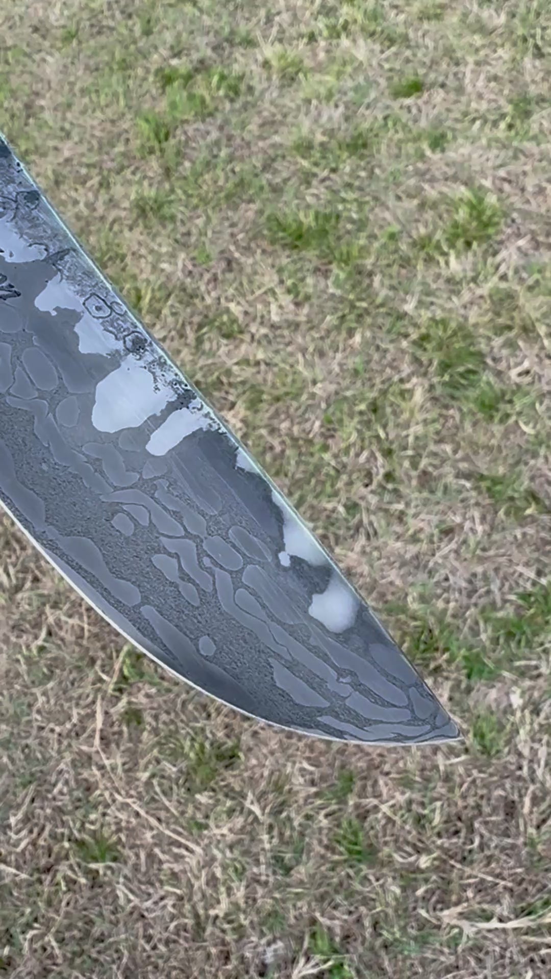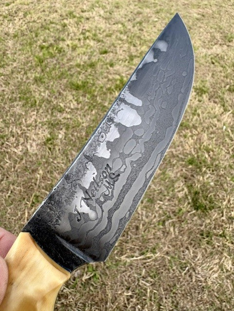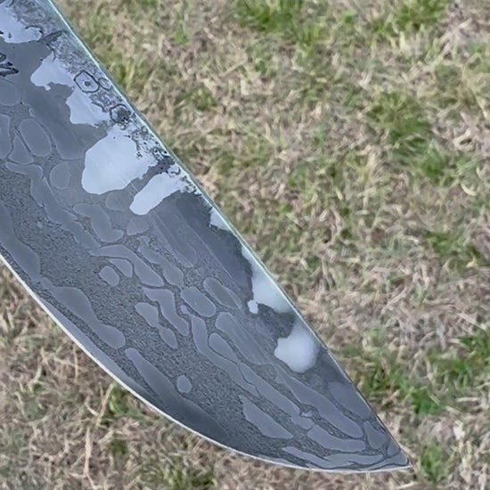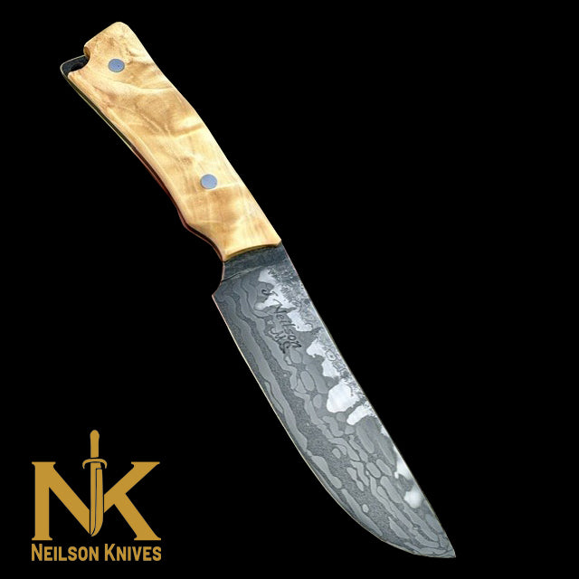 This fully quenched, full tang Fighter/Field knife is forged from high carbon San Francisco bridge cable and 1095HC powdered steel done in a canister weld. Along with forge marked/acid soaked flats, this knife has a thumb rise for comfort/control and a beveled spine. This blade has a 5" cutting edge and is 10 1/8" overall, weighing in at 8.3 oz. The steel tang is etched as well to bring out all of the steel patterning. The handle scales are stabilized A-grade Quilted Cottonwood done in a "palm swell" style with Blue/Grey G-10 tang liners and secured with etchable J-bolt (handle bolts) and has an exposed lanyard hole on the pommel. This knife comes with a border tooled and two-toned leather pouch sheath with contrasting stitching and a belt loop by Gerald Harper, Saddle Mountain Leather.