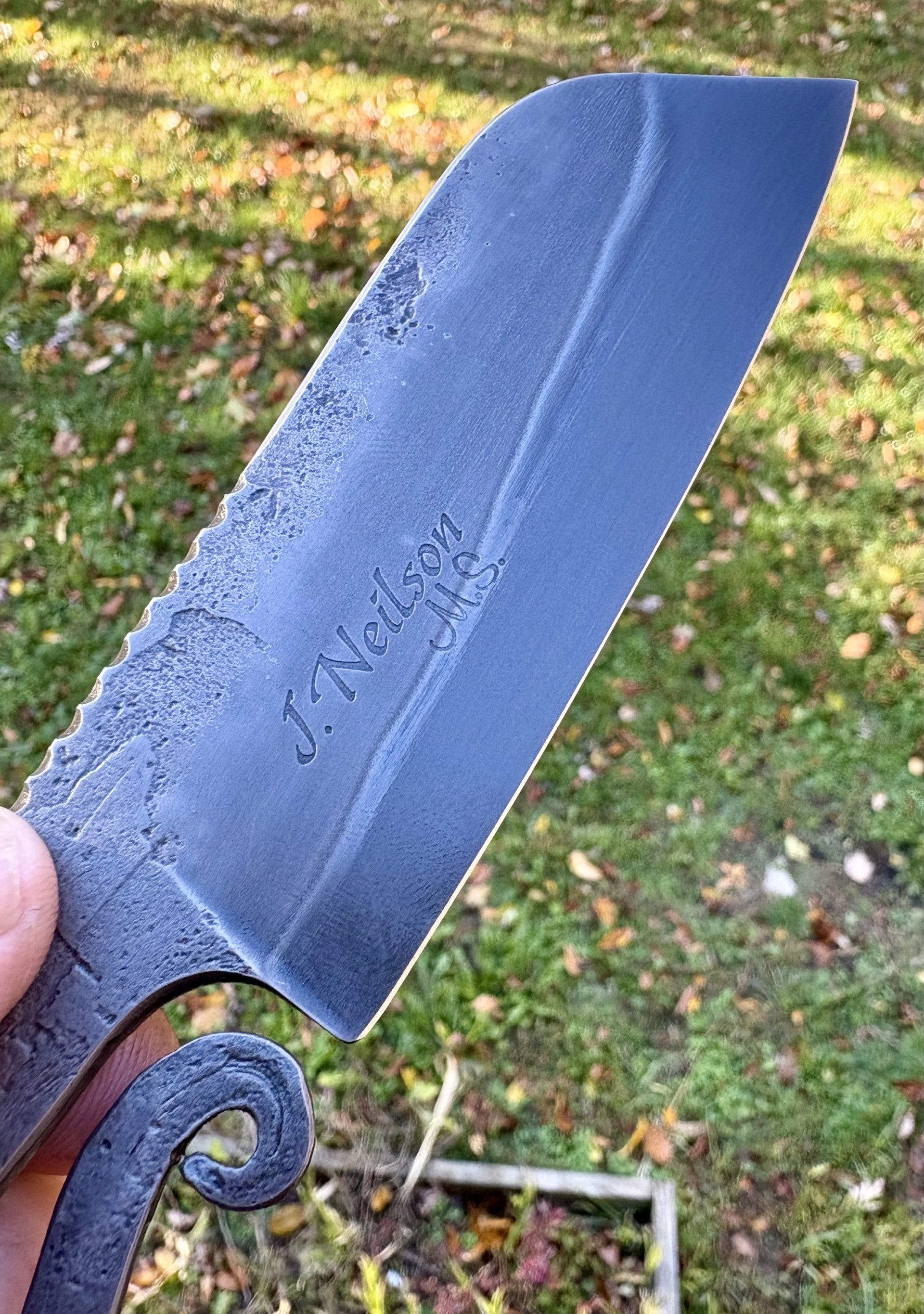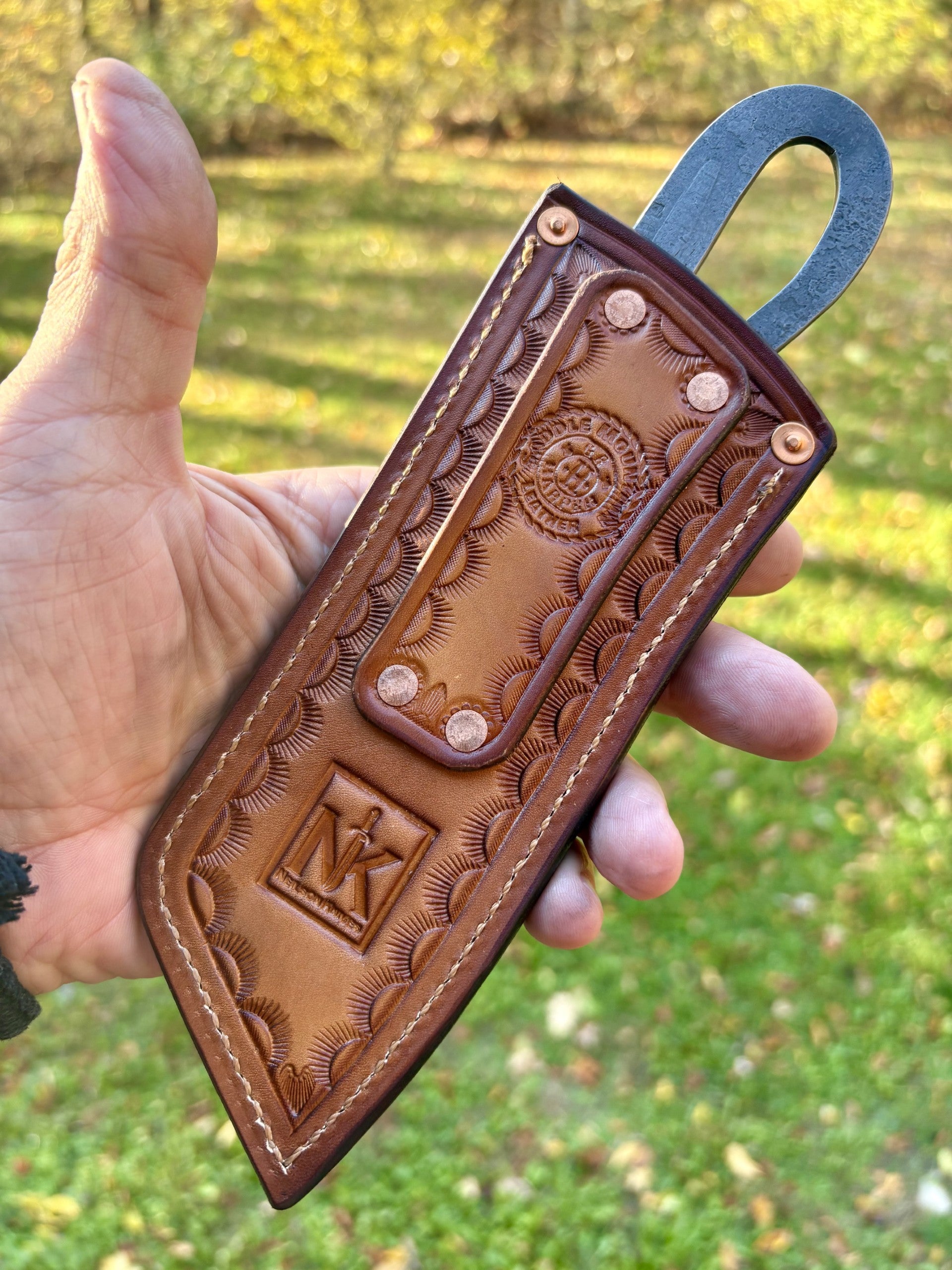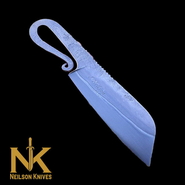 This curly tailed Hunter/Utility Knife is forged from 1084 high carbon steel. This knife has hand-rubbed bevels and is edge-quenched and etched to show the Hamon/quench lines. This piece also has a file worked thumb rest and forge marked/acid soaked flats. This blade has a 4 5/8" cutting edge and is 8 3/8" overall, weighing in at 4.8 oz. The steel tang is drawn and curled into a handle. This knife comes with a fully tooled leather pouch sheath with a belt loop by Gerald Harper, Saddle Mountain Leather.