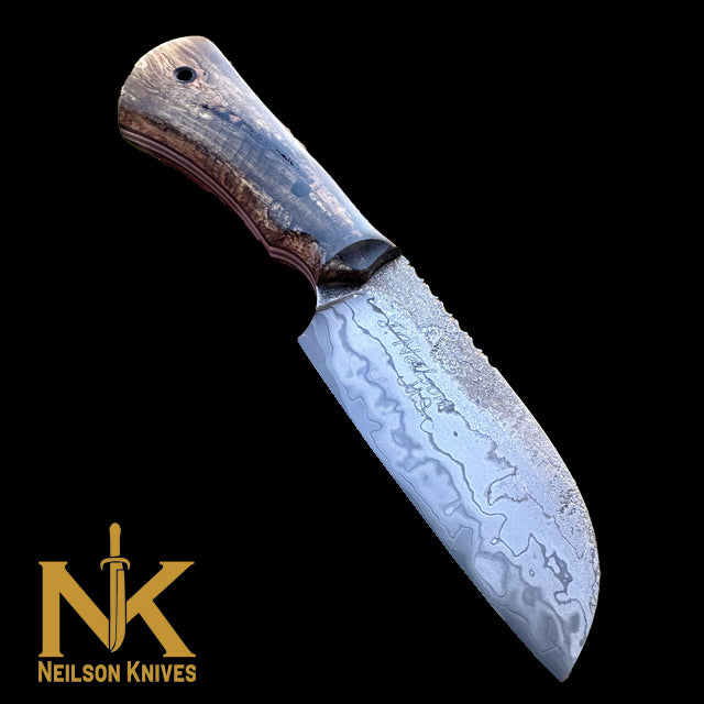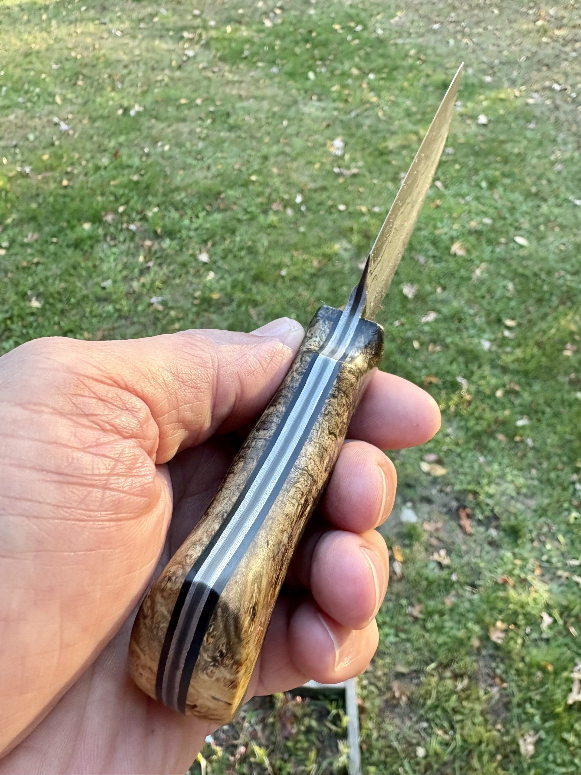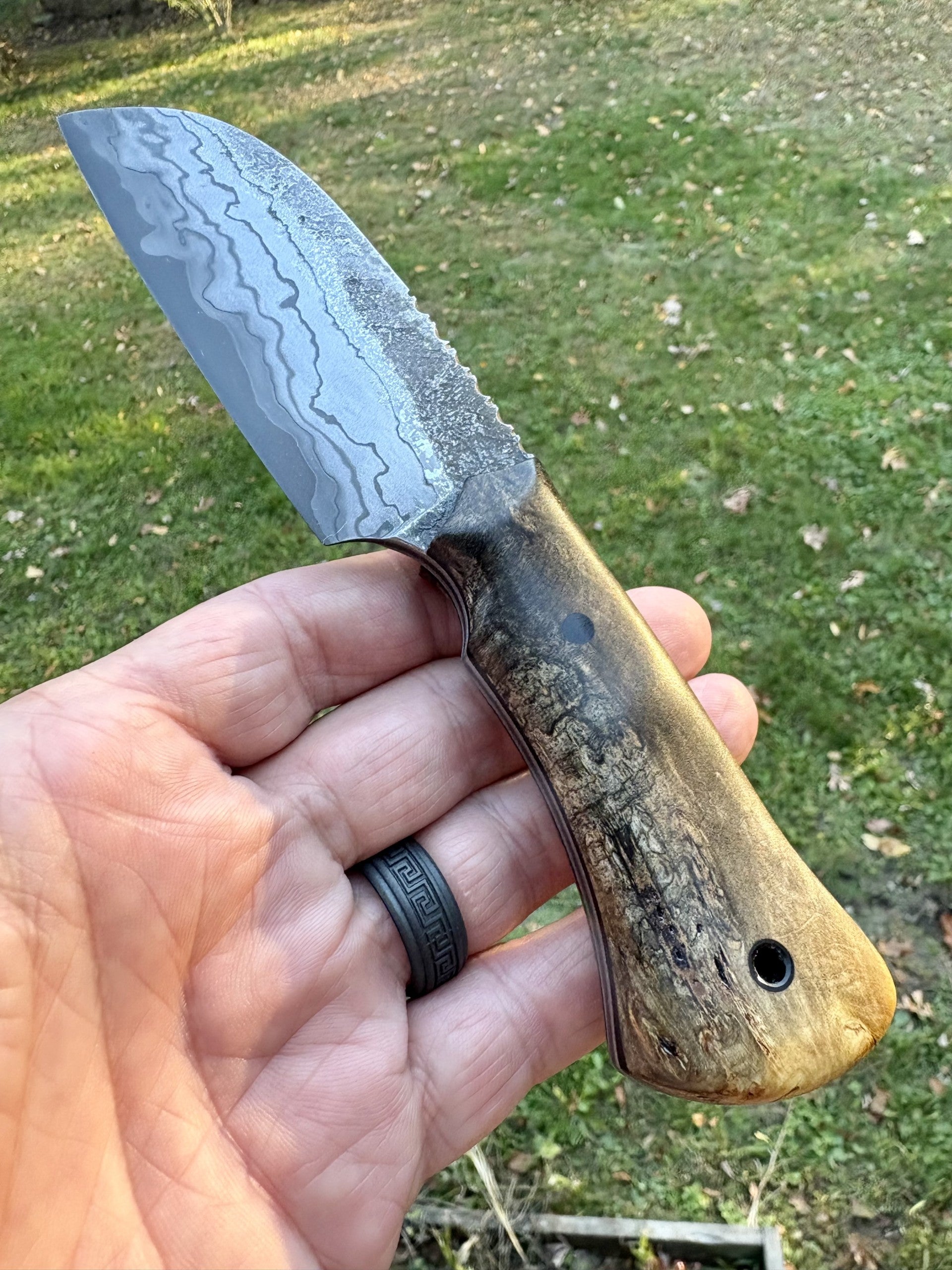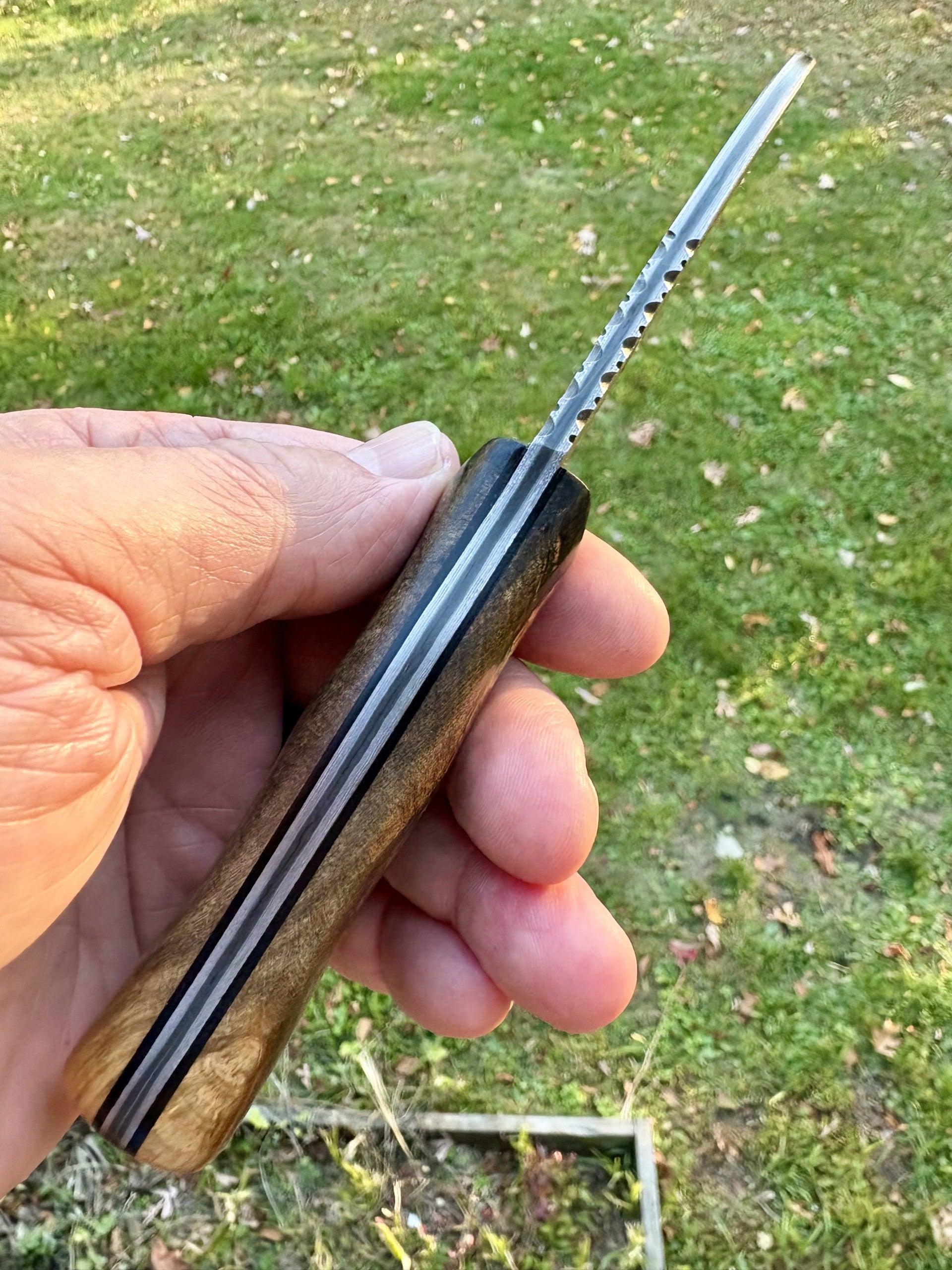 This hidden-tang Belt/Utility Knife is forged from Japanese Suminagashi high steel (11 layers on each side with a core of Takefu "White Steel") gifted to me by another Maker. Aside from being fully etched to bring out the pattern, this blade has a file worked thumb rest and forge marked/acid soaked flats. This blade has a 3 5/8" cutting edge and is 7 5/8" overall, weighing in at 6.4 oz. The contoured handle is stabilized and cross-cut California Buckeye Burl wood with black G-10 tang liners secured with a matching black G-10 pin and lanyard liner (as a 2nd pin). This knife comes with a tooled/two-toned leather pouch sheath with a belt loop by Gerald Harper, Saddle Mountain Leather.