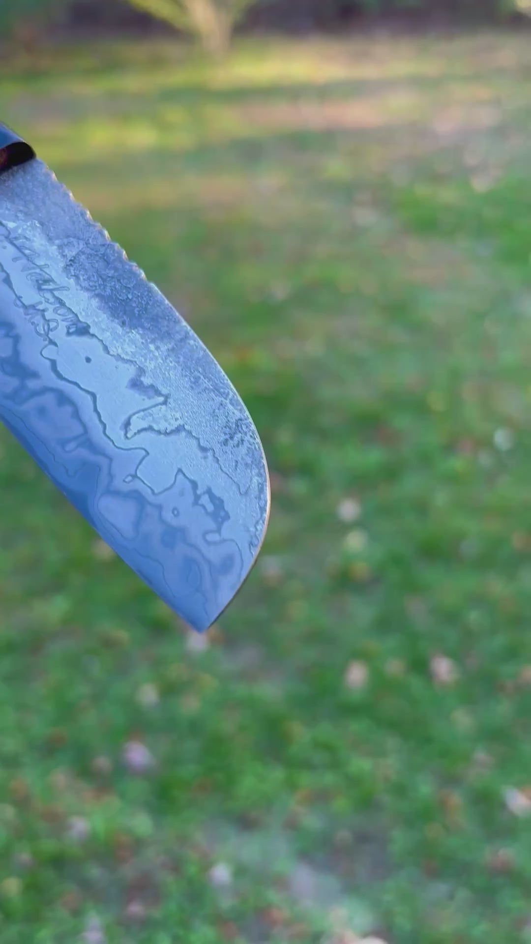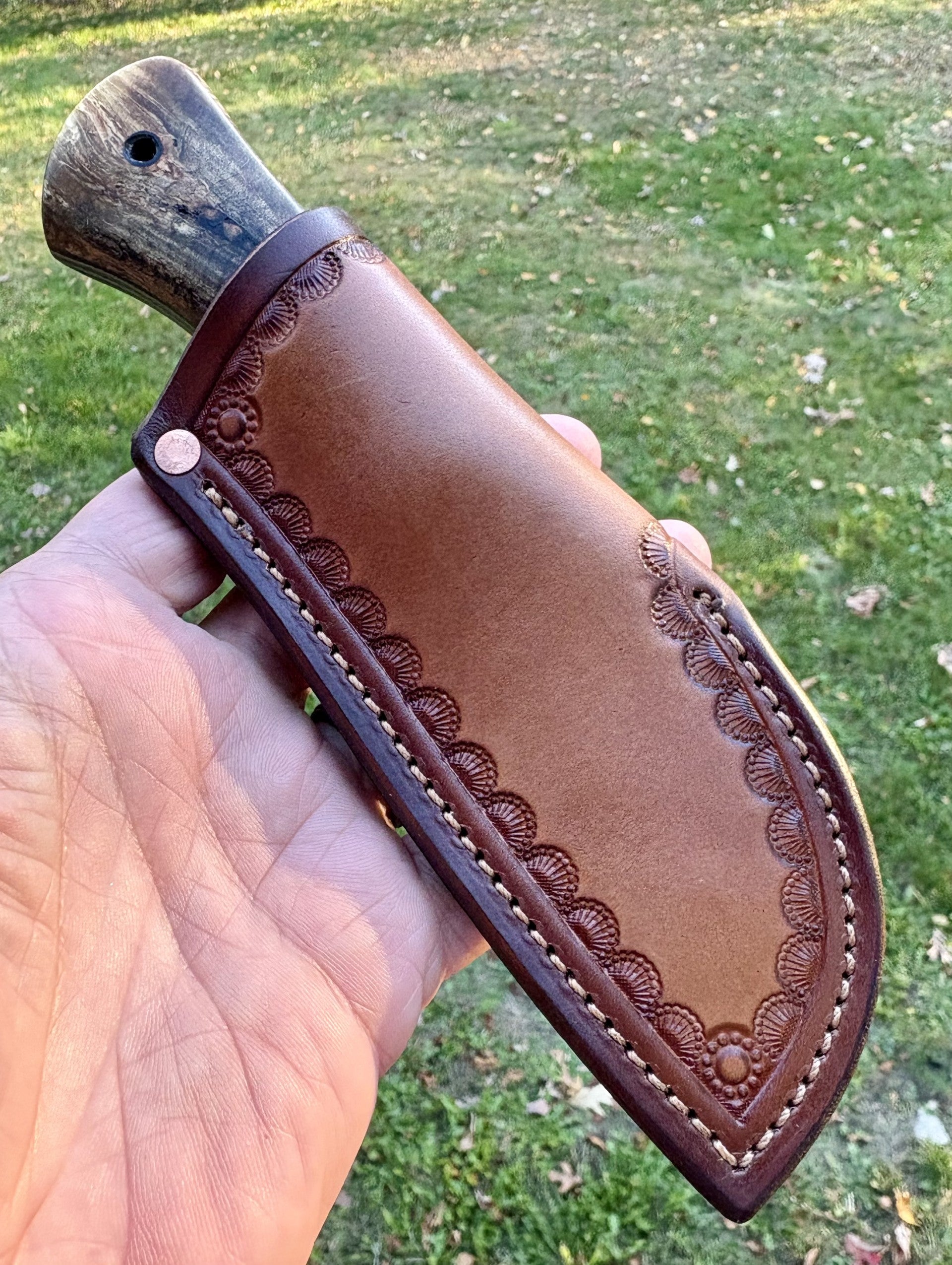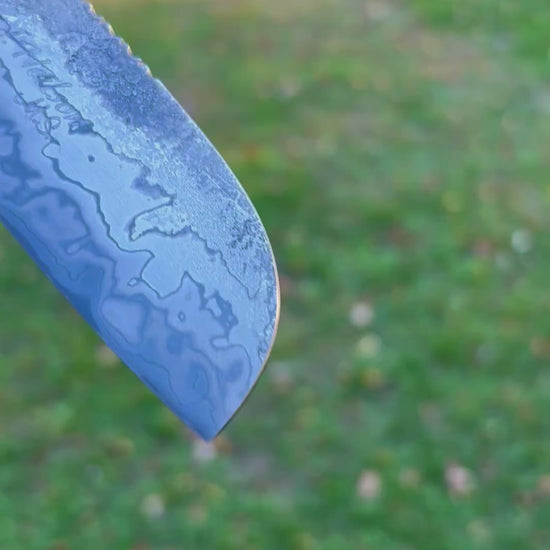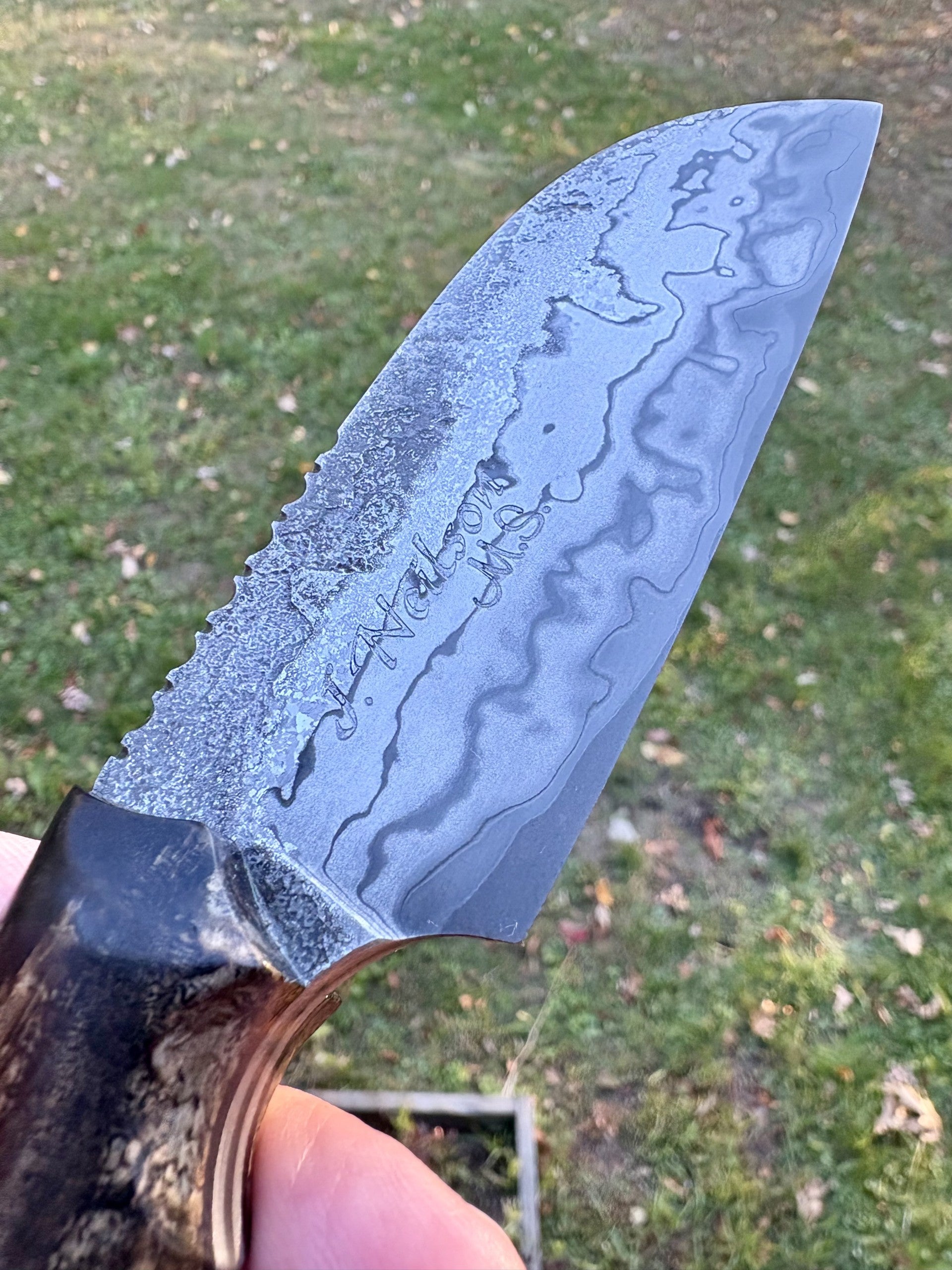 This hidden-tang Belt/Utility Knife is forged from Japanese Suminagashi high steel (11 layers on each side with a core of Takefu "White Steel") gifted to me by another Maker. Aside from being fully etched to bring out the pattern, this blade has a file worked thumb rest and forge marked/acid soaked flats. This blade has a 3 5/8" cutting edge and is 7 5/8" overall, weighing in at 6.4 oz. The contoured handle is stabilized and cross-cut California Buckeye Burl wood with black G-10 tang liners secured with a matching black G-10 pin and lanyard liner (as a 2nd pin). This knife comes with a tooled/two-toned leather pouch sheath with a belt loop by Gerald Harper, Saddle Mountain Leather.