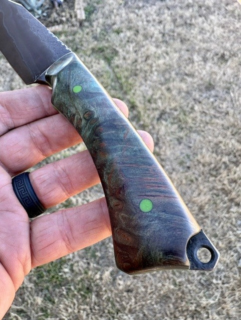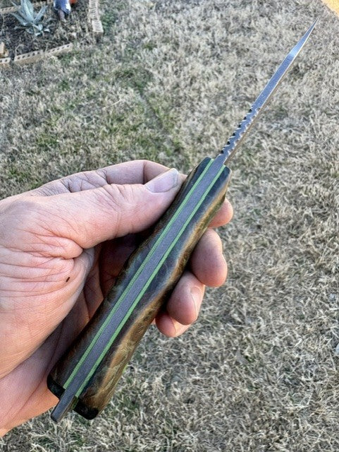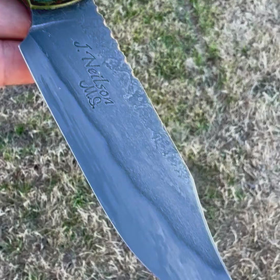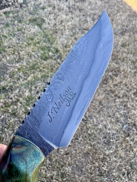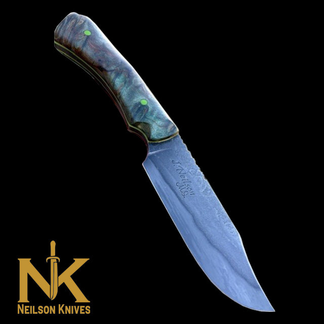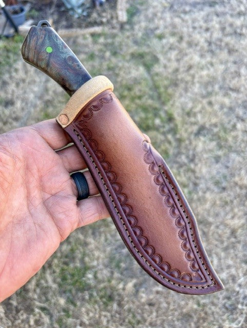 This full-tang Hunter/Utility Knife is forged from W1 high carbon steel. This knife has hand-rubbed bevels and is edge-quenched and etched to show the Hamon/quench lines. This piece also has a file worked thumb rest, beveled clip and forge marked/acid soaked flats. This blade has a 4 1/2" cutting edge and is 9 7/8" overall, weighing in at 7.3 oz. The handle scales are "palm swelled" Green dyed/stabilized Box Elder Burl secured with G-10 Toxic Green pins and has matching tang liners. This knife comes with a tooled and two-toned leather pouch sheath with a belt loop and Deer skin lining by Gerald Harper, Saddle Mountain Leather.