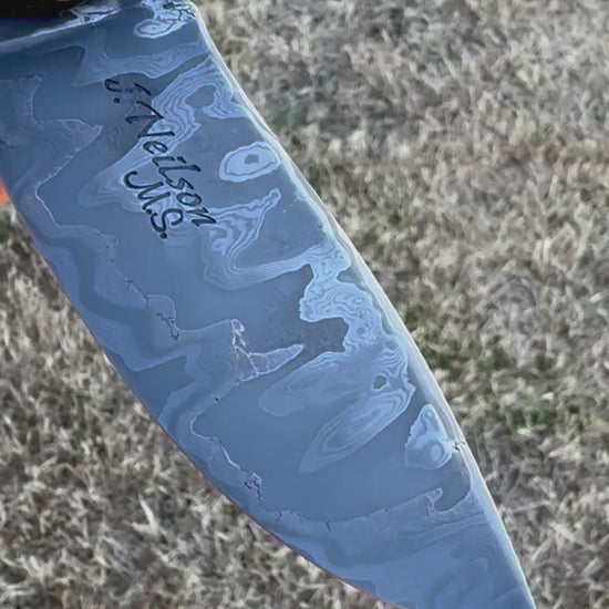 This full-tang, fully-quenched blade is forged from a combination of 1084HC, Japanese White laminate and copper that's been acid etched (blade and tang) to show the pattern though the entire knife. The flats are forge marked/acid soaked as well. The blade has a thumb rise, integral guard and beveled spine/clip. This blade has a 4 1/8" cutting edge and is 9 1/8" overall, weighing in at 6.8 oz. The handle scales are stabilized A-grade California Buckeye Burl (with a small bit of green acrylic towards the pommel) along with black G-10 tang liners. The handle is done in my "palm swell" style and is secured with mild steel (J-bolt) handle bolts with a stainless steel and black Lone Star accent pin. This knife comes with a fully tooled/carved and two-toned leather pouch sheath with a belt loop by Gerald Harper, Saddle Mountain Leather.